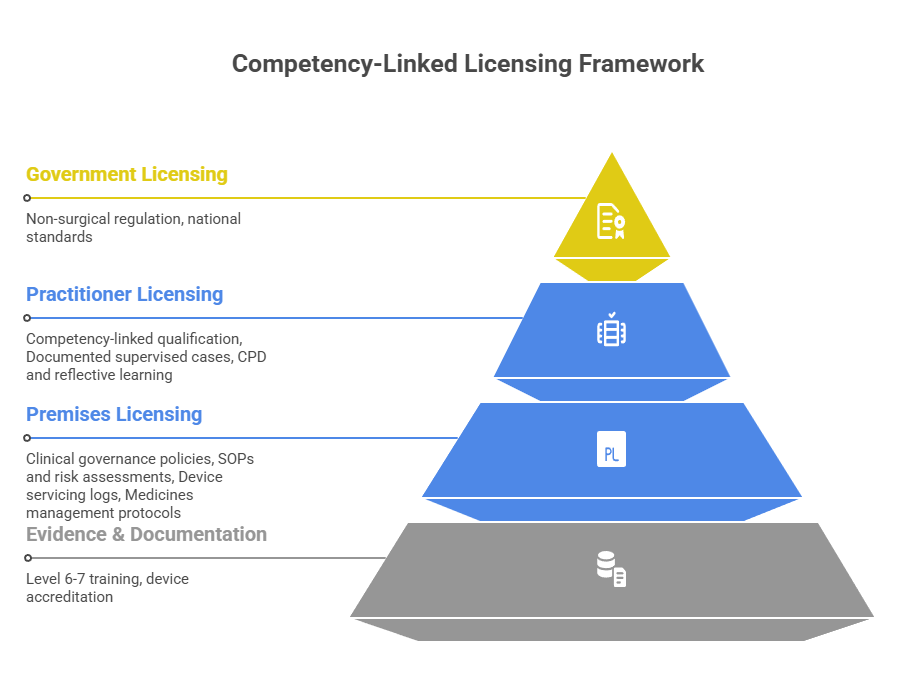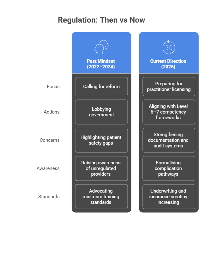 Associations consistently emphasise patient safety frameworks, complication readiness and documented consent processes. Training providers highlight alignment with anticipated licensing and formal education standards.