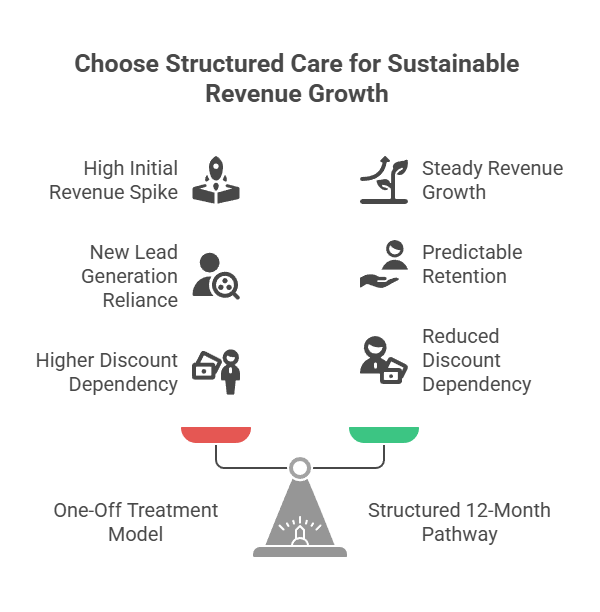 A patient on a structured 12-month collagen pathway is far more commercially stable than a patient chasing single discounted sessions.
