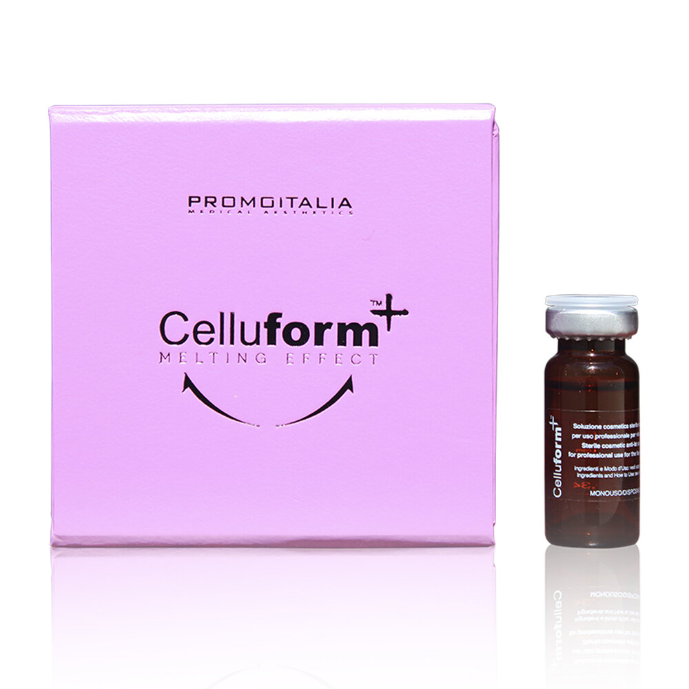 Celluform and Celluform Plus are injectable lipolytics made in Italy by PromoItalia. They are often referred to as fat dissolving injections and are used to reduce small areas of localised fat deposits on the face and body, to contour areas such as hips, thighs, the abdomen, and double chins.